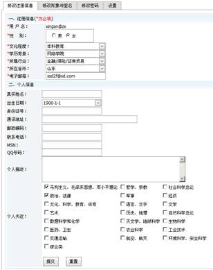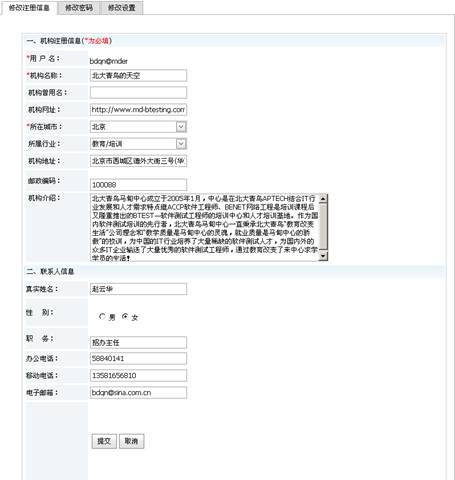 根据表单项目的提示,将对应的信息内容填写完全后,点击【提交】保存新修改的注册信息。如果没有改动直接点击【提交】,信息内容将不会改变,点击【取消】,系统将放弃修改后的内容保留原始内容记录。 |