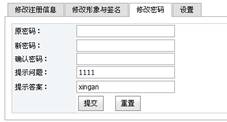 输入原来的密码,再输入两次新的密码,两次必须一致,并且输入注册是预留的提示问题和提示答案。只有问题、答案、原来密码都正确的情况下,新密码才可以更改成功。 |
