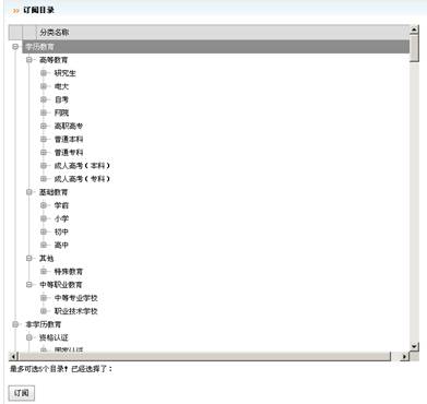 在目录树中选择需要的分类,但最多只能选5个目录分类,点击【订阅】按钮,完成操作后系统给出相应提示。点击【订阅目录记录】便可以看到订阅分类下的资源信息。 |