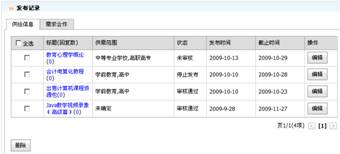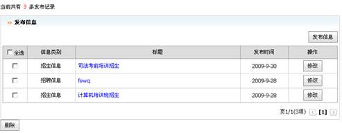 机构用户发布的培训招生信息,都会被记录下来,如图2-2-6-1-1所示。提供了信息删除、信息发布、记录信息查看、信息修改功能。