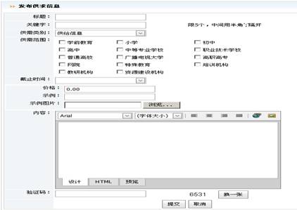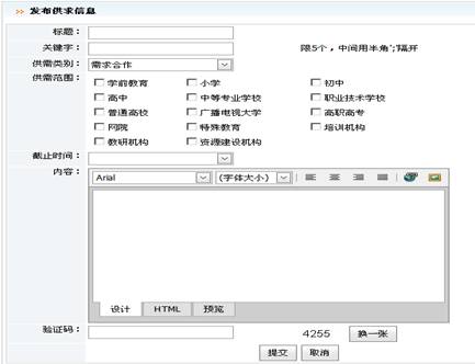 个人用户、教师和机构用户都可以存在供求信息,信息流转到交易平台中的供求信息栏目中。用户可查看、添加、编辑、删除个人发布的供需信息,还可以方便的查看回复信息。用户发布信息后,需有后台管理员审核发布后前台交易中心才可显示信息。