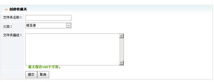 在【文件夹名称】文本框中输入要建立的收藏夹的名称,随后可选择收藏夹所属的树形结构位置,默认为“根目录”,也可选择其他已经存在收藏夹座位父目录。在【文件夹描述】中输入对这个收藏夹的描述性问题。点击【提交】建立收藏夹。 |