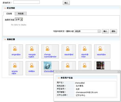 用户可添加本中心用户为好友,建立与其他用户之间的联系。互成好友后可互发短信。添加好友后需等待对方审核,审核通过后才可互成好友。系统还提供好友分组功能,便于对好友进行分类管理。好友组由用户自行维护,详见2.1.7.2好友组管理。最新注册列表中显示本中心最新注册的个人及机构用户。