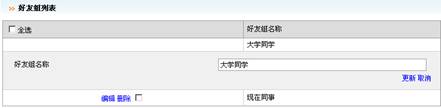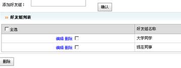 第三:删除好友组,点击列表中每一条记录的【编辑】按钮,可删除该条记录。如果删除的好友组已经被使用,则该组中的好友将全部归为【好友】组中,继而可重新进行分组。