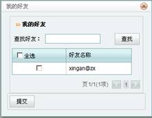 第一:添加收件人,可手动输入好友名称,如果输入的好友名称错误,将提示【该好友不存在】;也可点击【好友列表】进行选择,如图2-1-8-1-2,在【我的好友】页面中,可以输入好友名,点击【查找】方便快捷找到好友,也可在好友列表中直接勾选好友。确定好友后,点击【提交】按钮,好友名称将回显在图2-1-8-1-1的【收件人】文本框中。