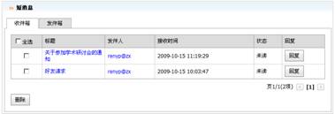 提供已收到的短信和已发送过的短信展示列表,列表内容包括标题、发件人、收件人、时间、状态和回复查看。可以通过点击【标题】、【发件人】和【回复】的链接查看短信内容页面、用户信息页面和回复信息页面。【删除】按钮,可删除不要的内容信息。