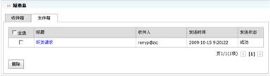 第六:发件箱,对记录进行删除操作,此功能需要在单独点选了某一记录前面的“复选框”或点选列表表头的“全选”复选框。被选择的记录将被删除。 |