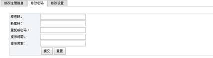 为用户提供修改密码功能,用户需输入原密码经过系统匹配成功后,新密码才可生效,此处用户还可以修改提示问题及提示答案。