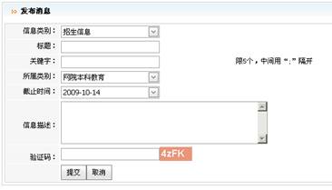 第三:如果是信息修改,记录原始的信息类别是“招生信息”,重新选择了除此之外的其他两个后,原始的“所属类别”也将不被保留,取而代之是空值。如果原始的招生信息是其他两项,更改后为“招生信息”,所属类别必须选择,且保存选择后内容。修改时,也需要填写正确的验证码后方可提交成功。 |