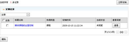 机构用户可以添加根据自身需求而产生的自身定制信息,并且可以选择接收对象—其他地方中心。由接收方根据信息内容,资源情况作出详细回复。页面存在【立即定制】、【删除】、【回复查看】、【记录详情】功能。