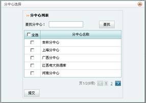 可以选择“定制对象”,需要勾选【分中心】选项前的多选按钮,【搜索】按钮状态才可变为可用。点击【搜索】,弹出地方中心选择列表,可以从列表中选择其他地方中心,如图2-2-7-2-2所示。勾选【名称】列前的多选按钮,点击提交,确认选择的地方中心。(注意:一次只能选择不超过5个分中心)